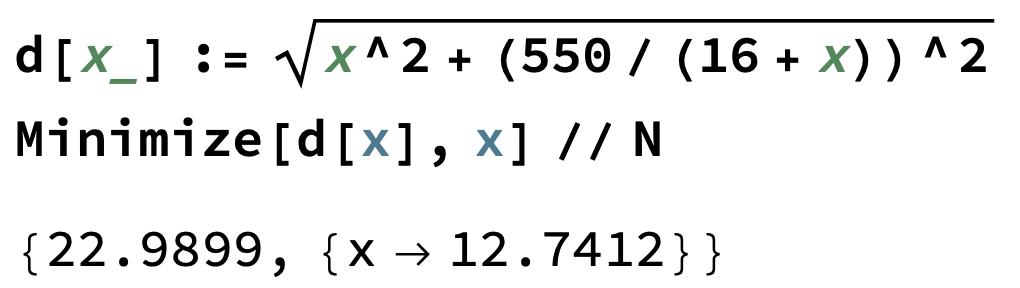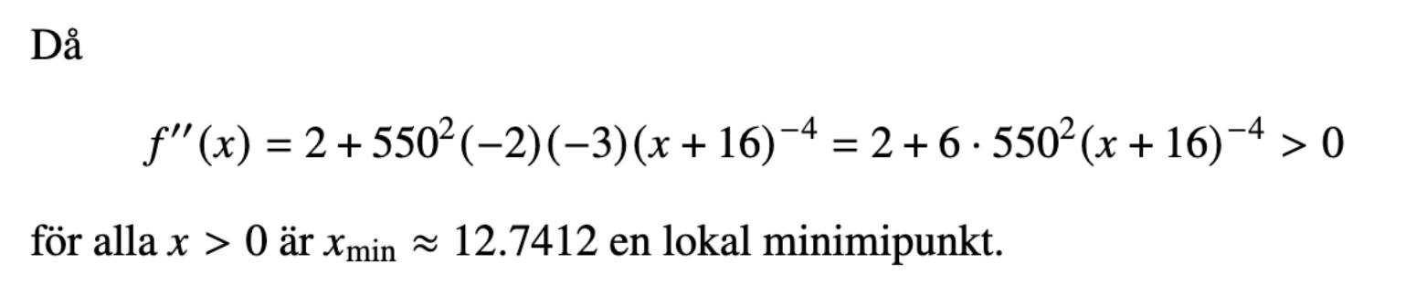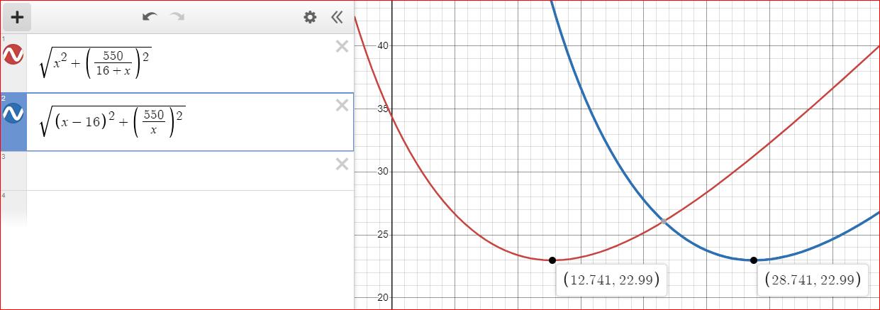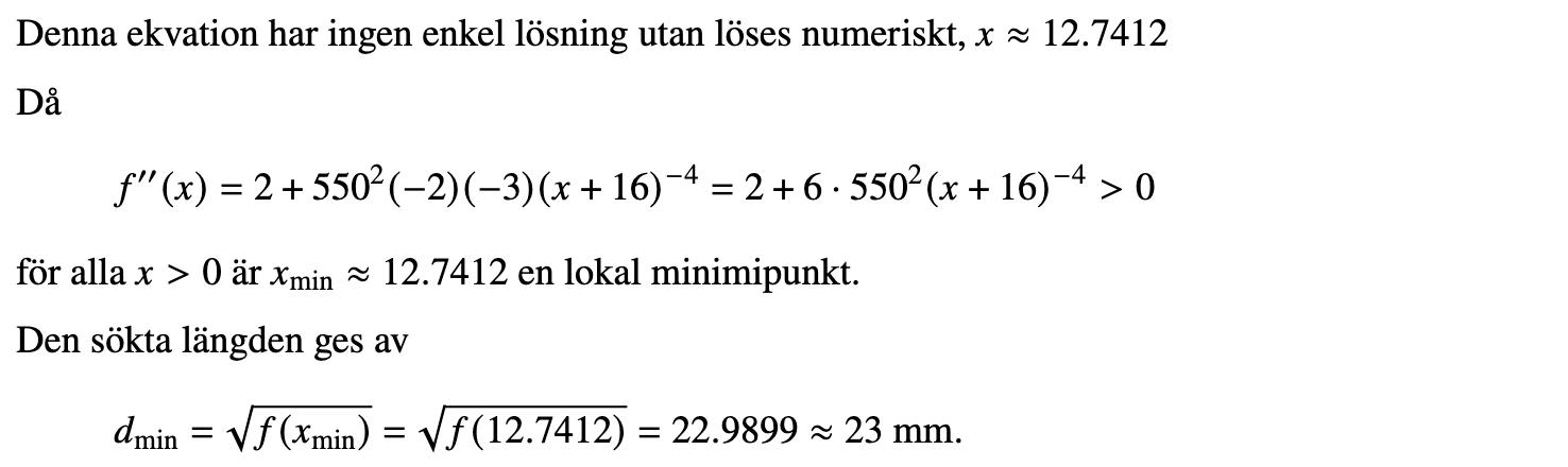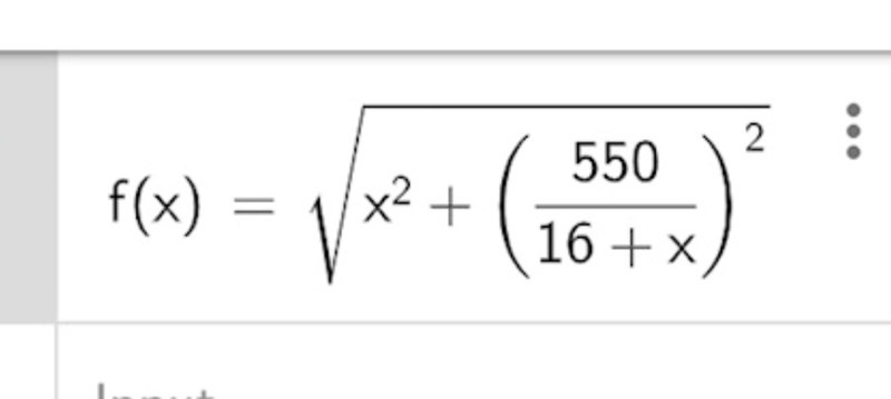 Du har skrivit detta till mig: Du ska skriva x^2+(500/(16+x))^2 under/innanför rotenur-tecknet