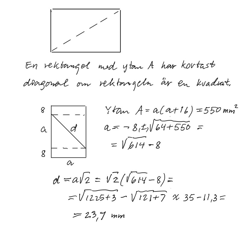 Jag förstår det som jag förklarat och sett på video. Och nu förstår jag a=550 då man tar b*h=550 iom att man tar för rektangelns area och inte triangelns o sedan när man fått ut h=b/550 så tar man höjden på rektangeln -16 som således blir höjden på triangeln som är sida a2 och som således blir 550/b-16