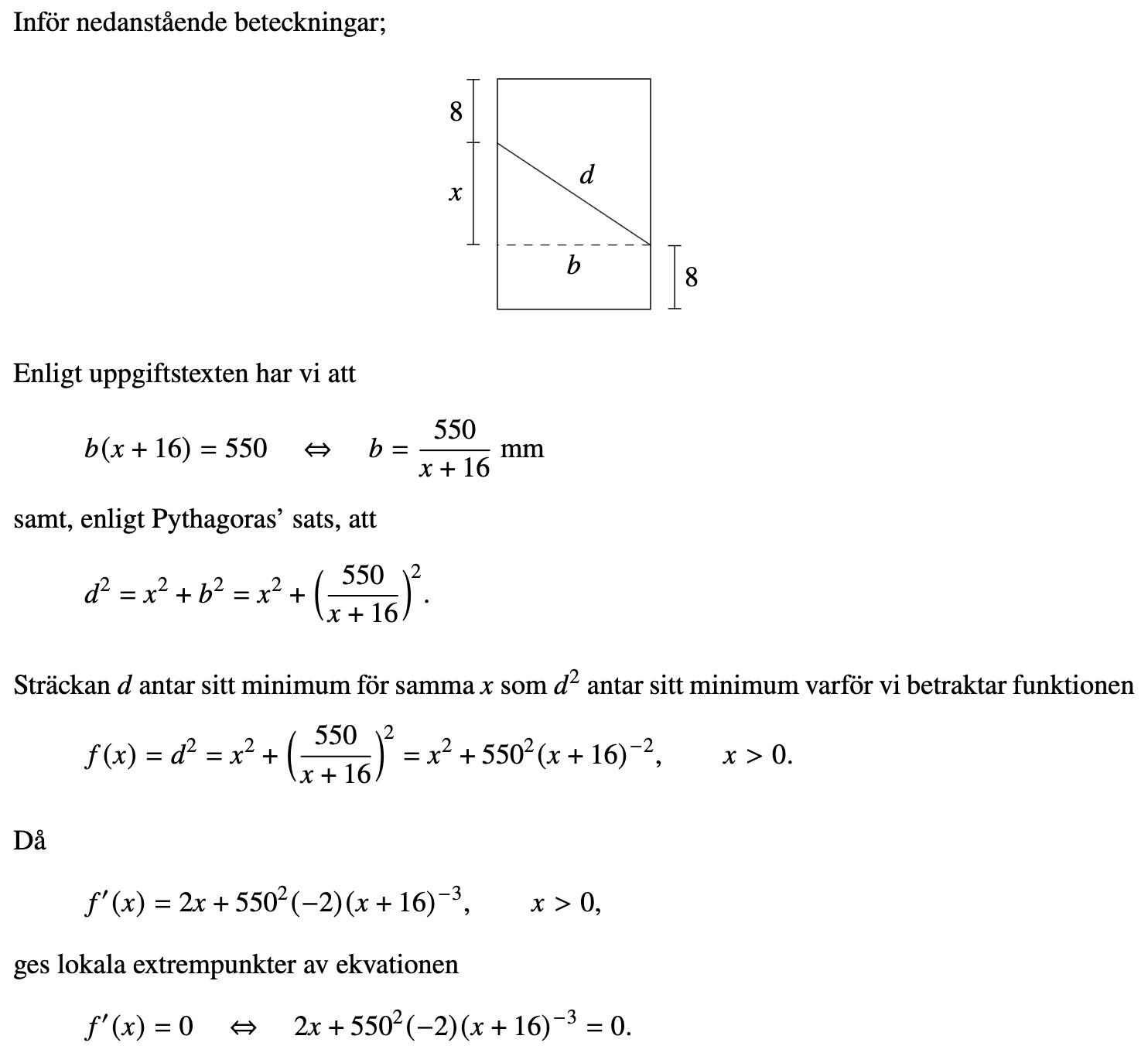 Man har höjden h=h-16 och man ska istället för denna variabel omvanlda den till varibalen med b så man kan sättai n den i ekvationen. Det blir då 550 (arean)=b*h som blir h=550/b som man då sätter in i stället i ekvationen. Då får man c2 +b2 +(550/b-16)