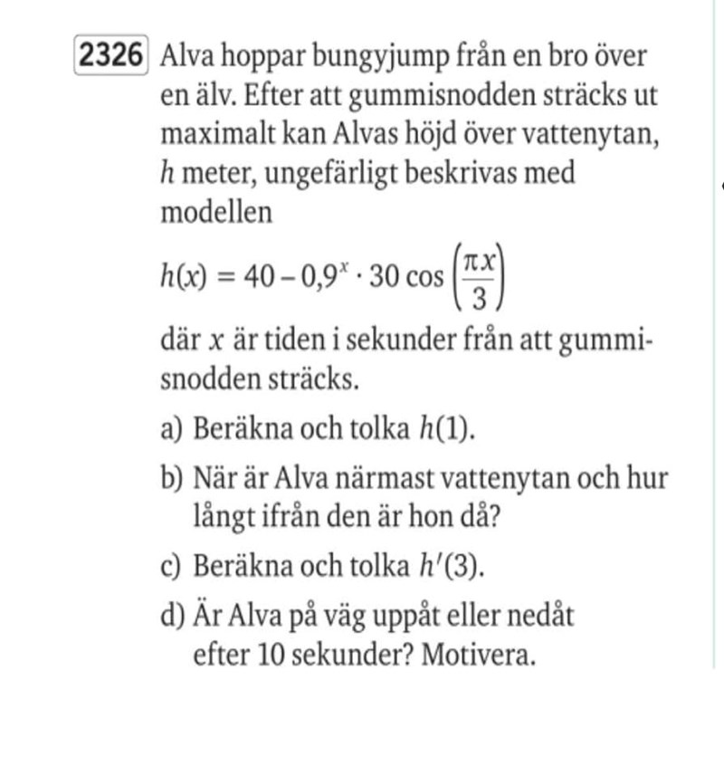 Hmm, som frågan är formulerad så måstte det gälla att definitionsmängden är och då är svaret att det inte finns någon tidpunkt då Alva är närmast vattenytan.