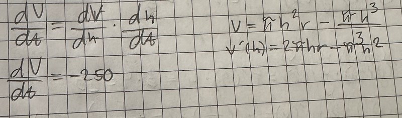 Du har dV/dt och du har dV/dh som en funktion av h. Sätt in att h är 2 för att få ut vad dV/dh blir då oljenivån är två meter.