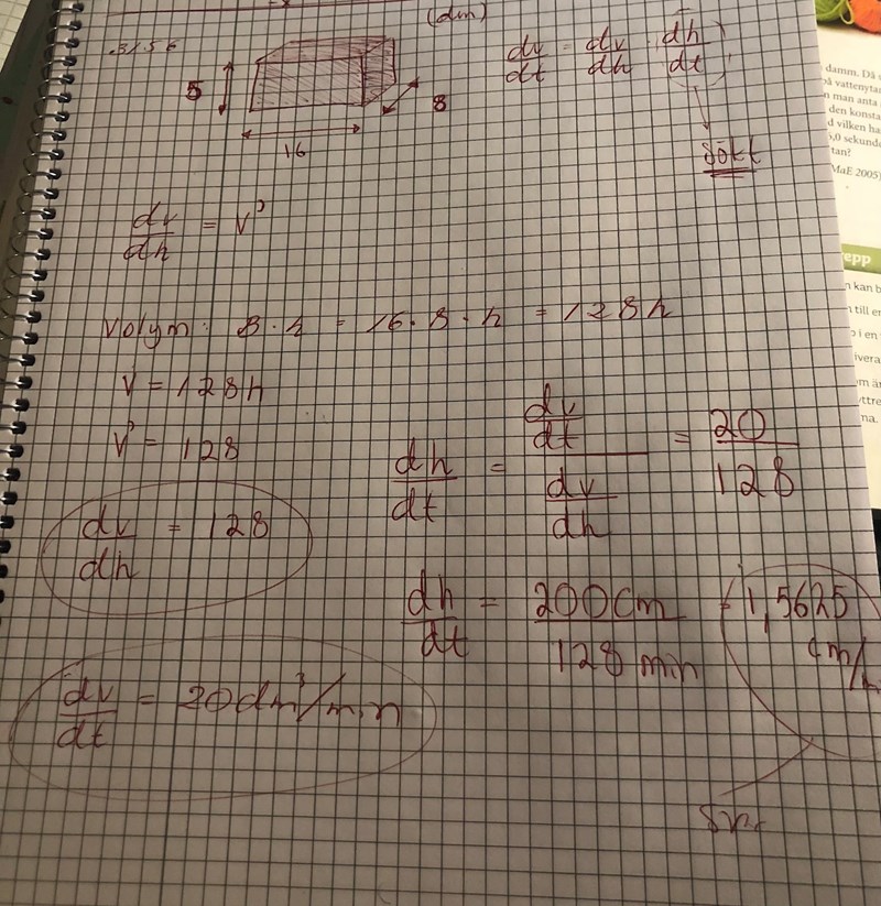 För volymen 128h så jag deriverade det och fick 128 vilket motsvarar dv/dh. Kan man göra så? Har gjort så tidigare i alla fall