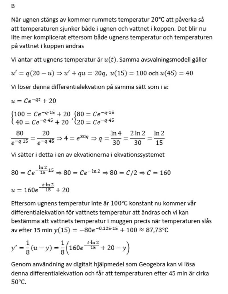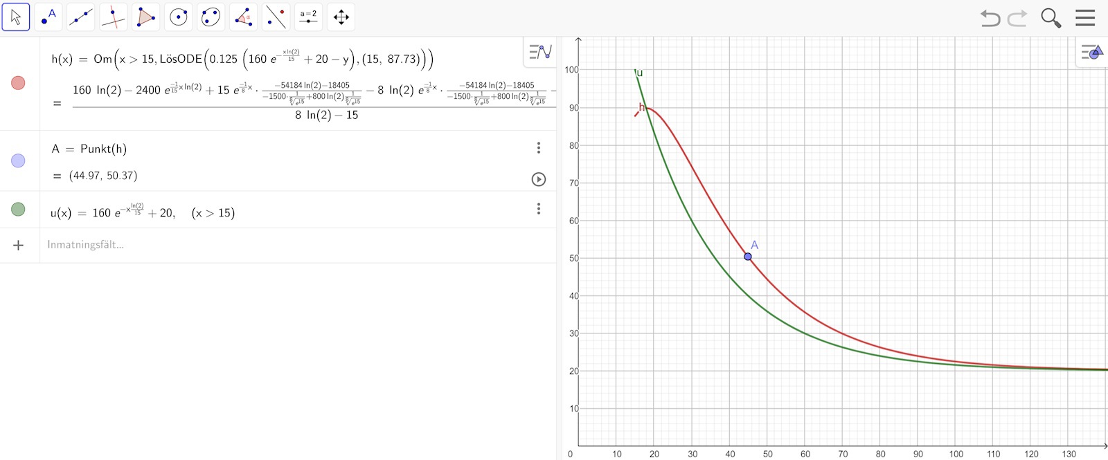 Såhär matade jag in i Geogebra. Den röda kurvan är lösningskurvan för vattentemperaturen i muggen, och jag satte en markör vid t=45 minuter, då vattentemperaturen är 50 grader Celsius. Jag ritade även in lufttemperaturen i ugnen (grön kurva) för att kontrollera att den röda kurvan verkar rimlig. Vattentemperaturen kommer att stiga från t=15min till t=18min, eftersom vattnet värms upp av ugnsluften. Vid t=18 min så har ugnslufttemperaturen sjunkit ner till vattentemperaturen, och kommer därför därefter att kyla ner vattnet. Både vatten och ugnslufttemperaturen kommer asymptotiskt att gå mot rumslufttemperaturen: