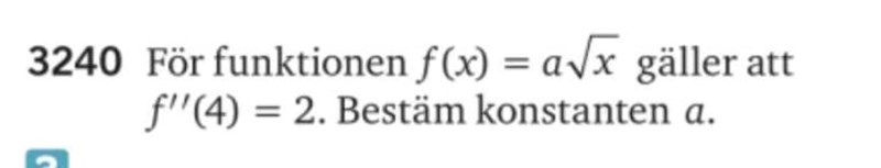 Nu kan du använda det givna villkoret: f''(4) = 2 säger att om x=4 ska andraderivatans värde vara 2. Du kan alltså bilda ekvationen