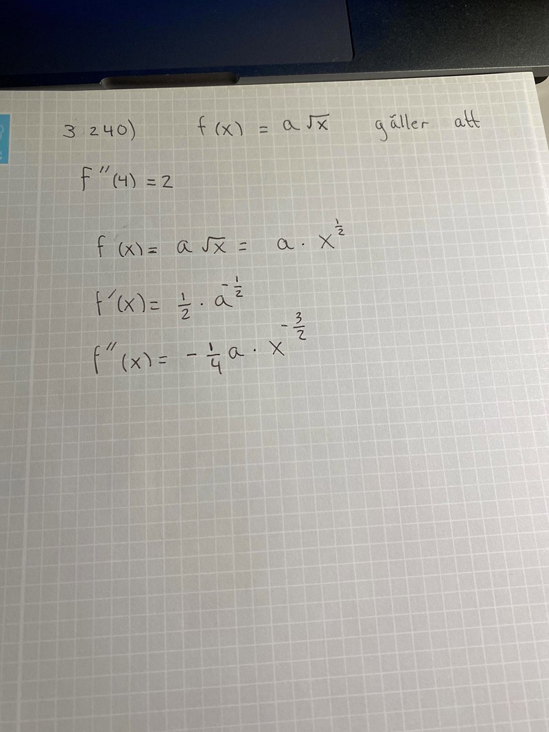 Jag har gjort det och fick det till -1/4ax^-3/2 är det rätt? och hur gör man nu?