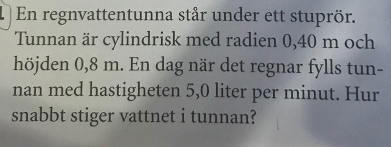 Hur stor tvärsnittsarea har tunnan? Hur tjock är en skiva som motsvarar 1 liter? Eftersom man räknar i liter, som är samma sak som kubikdecimeter, är det smart att räkna alla längder i dm, så slipper man göra fel på enhetsomvandlingarna.