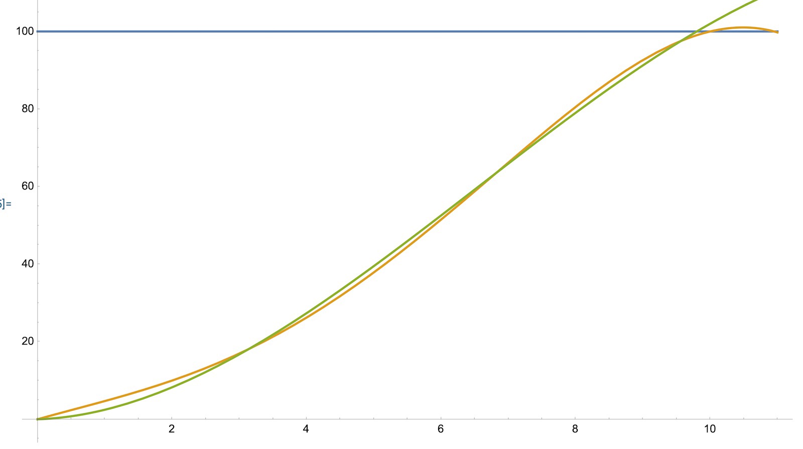 Avståndet mellan dem ges av |sa(x)–sb(x)| på intervallet [0, 9.8];