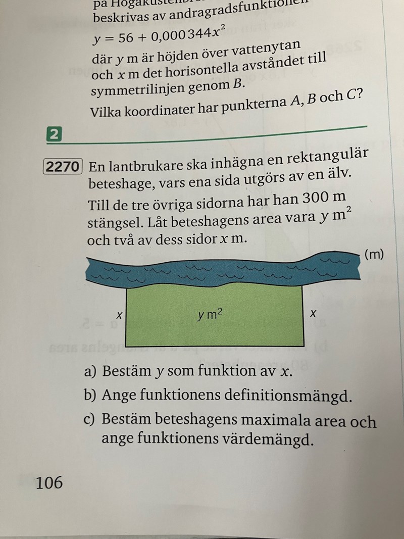 Det rör sig om 2270 a, jag vet inte om jag förstår rätt men. Det blir y= 300-2x^2och inte y=300+2x^2, eftersom Lantbrukaren har 300 m till de tre övriga sidorna.