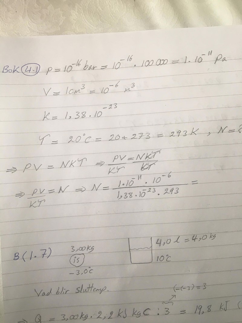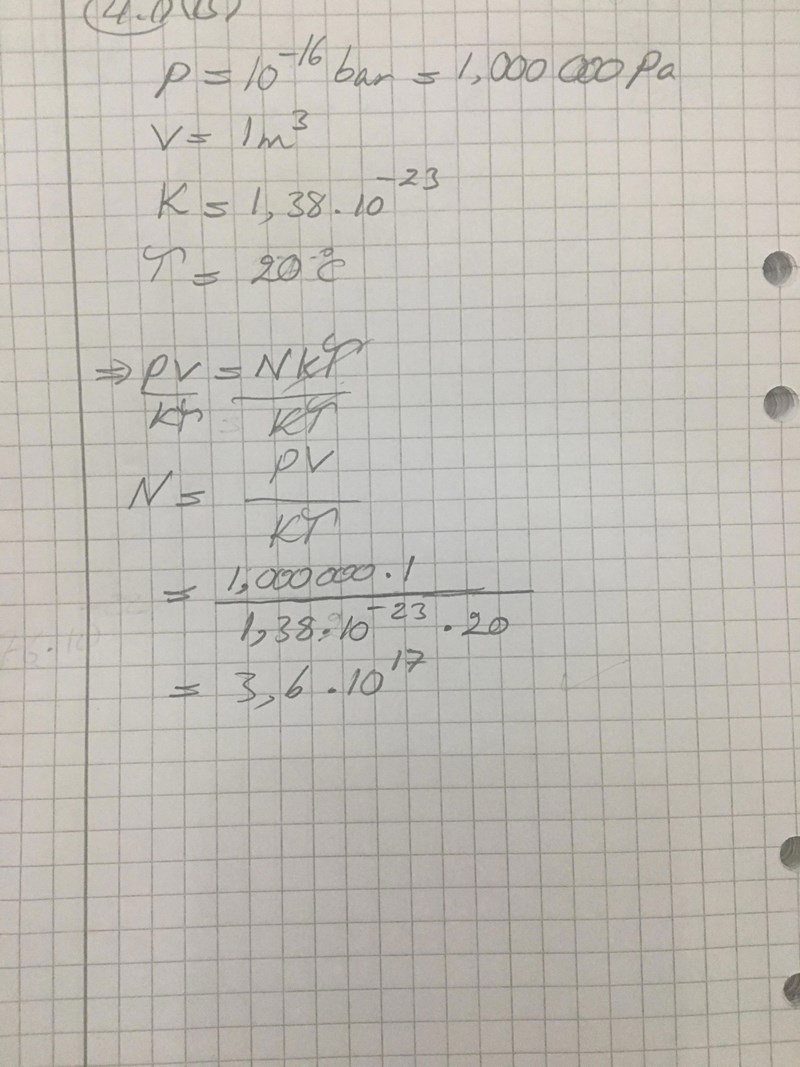 Frågan är : det lägsta tryck man kan få i ett laboratorium är av storleksordning 10^-16 bar. Hur många molekyler finns det i 1 cm ^3 vid detta tryck och vid rumstemperatur?