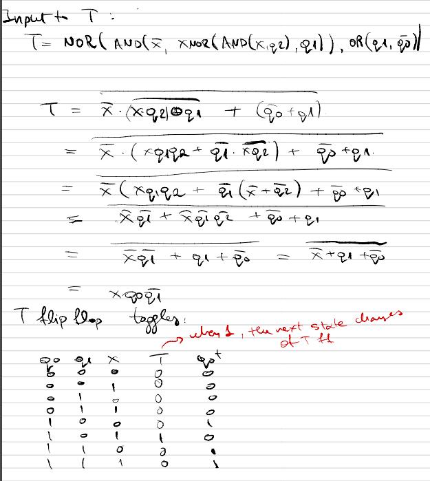 För att få fram de Boolska uttrycken är nog det bästa att börja vi t.ex. T-ingången på vippa Q0 och jobba sig bakåt. En NOR-grind med två ingångar som går till en NAND och en OR där ingångarna ....