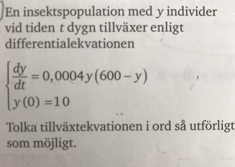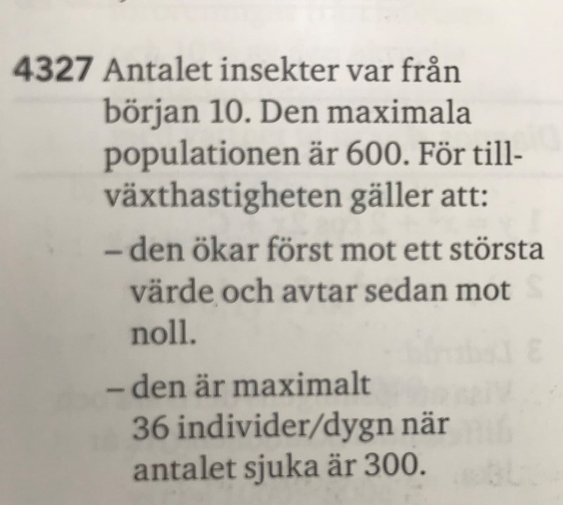 Tillväxthastigheten är då störst vid y=M/2=600/2=300 st individer. Då är den 0,06 insekter/dygn.