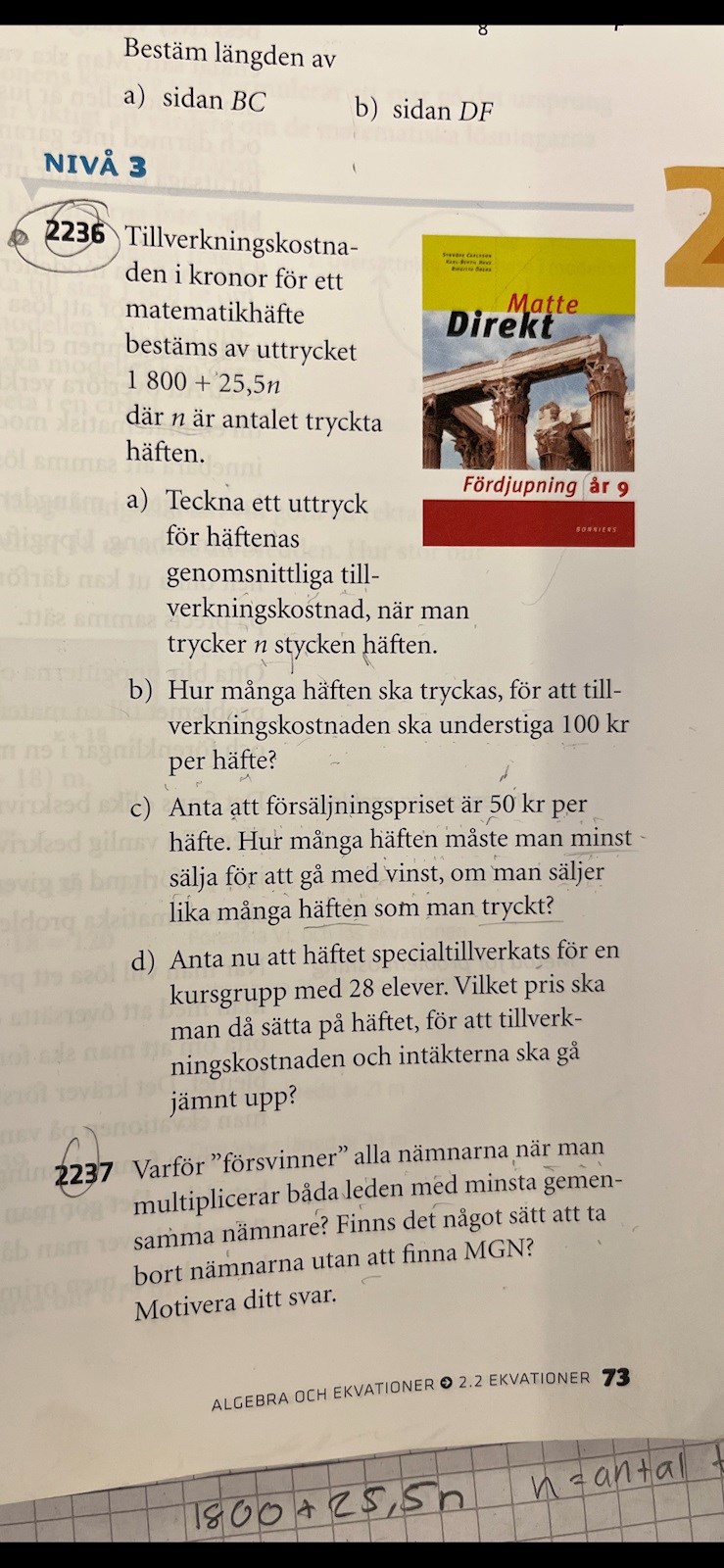 Nästan, men inte riktigt... Tidigare skrev du att tillverkningskostnaden var 1 800 + 25,5n (du har nog bara råkat trycka på fel tangent), dels skall det vara en olikhet, inte en likhet (d v s ekvation).