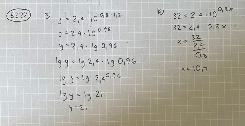 Jag löste a, tack. B har jag fortfarande svårt med. Blir 10^0,8x = lg 0,8x?