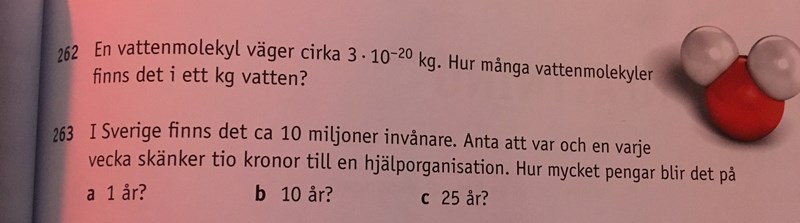 Jag har lite problem att förstå uppgifterna. En vattenmolekyl väger 0,00000000000000000003 kg. Hur många på 1 kg vatten? Sedan uppgift 263. Tänker jag att det är 52v* 10^7 Men enligt facit är det 5,2*10^9 Och b uppgiften så tänkte jag i så fall 52*10 =520 *10^7 att man tar 52 veckor gånger 10 som är år. Och sedan antal invånare.10 miljoner är väl 10^7 ? Jag tänker uppenbarligen fel , men även om jag kollar på facit förstår jag inte hur det kunde blivit det svaret :/