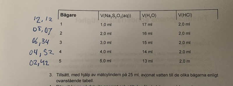 Det här är tiderna som jag fick. Man ska redovisa resultatet genom att ha koncentrationen och reaktionstiden i ett diagram. Koncentrationen ska räknas med hjälp av späddningsformel c1 x n1 = c2 x n2