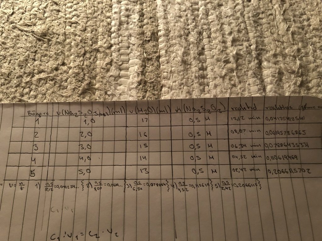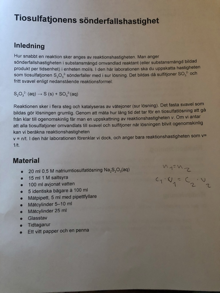I skolan gjorde vi en labb. Jag har skrivit upp all data, men jag behöver komma fram till en ny koncentration. Jag vet inte riktigt vilken koncentration. Jag tror att det kan vara koncentrationen på Na2S2O3 (efter reaktionen) som jag ska beräkna. Läraren sa att vi skulle beräkna koncentrationen med hjälp av förhållandet C1*V1=C2*V2. Men om det är så att jag ska räkna ut koncentrationen på Na2S2O3, vilken volym ska jag använda till V1 och V2? Är väldigt förvirrad.