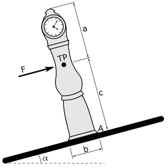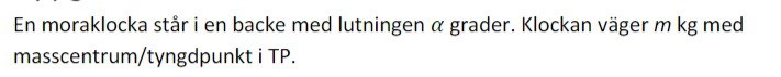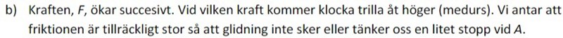 Tips: Titta på det resulterande medursmomentet kring punkten A. När detta blir större än 0 så tippar klockan åt höger.