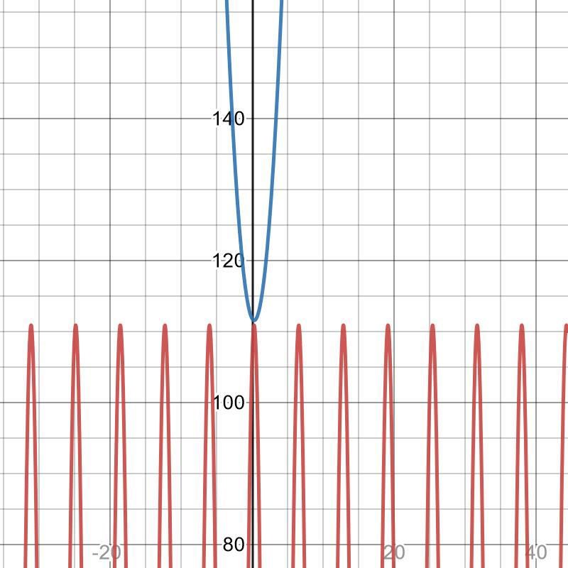 Notera att högerledet är en andragradare, så den är U-formad (eller U fast upp och ner). Du skulle kunna undersöka var extrempunkten ligger för att avgöra om hela kurvan håller sig på ena sidan vågen. Vilket också kräver amplituden på vågen =)