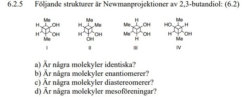 Jag har svårt med steroisomeri väldigt länge eftersom jag inte alltid tycker det är självklart vad som är en spegelbild av något annat. Tankarna går i virrvarr när jag snurrar på molekylen i mitt huvud och försöker granska den ur olika dimensioner och perspektiv. Det blir väldigt tidsödande när jag löser uppgifterna. Jag undrar därför om ni har tips på hur man kan angripa uppgifter som denna nedan. Finns det något ''strukturerat'' tillvägagångsrätt som ni använder er av? Hur gör ni t.ex när ni vrider på dem?
