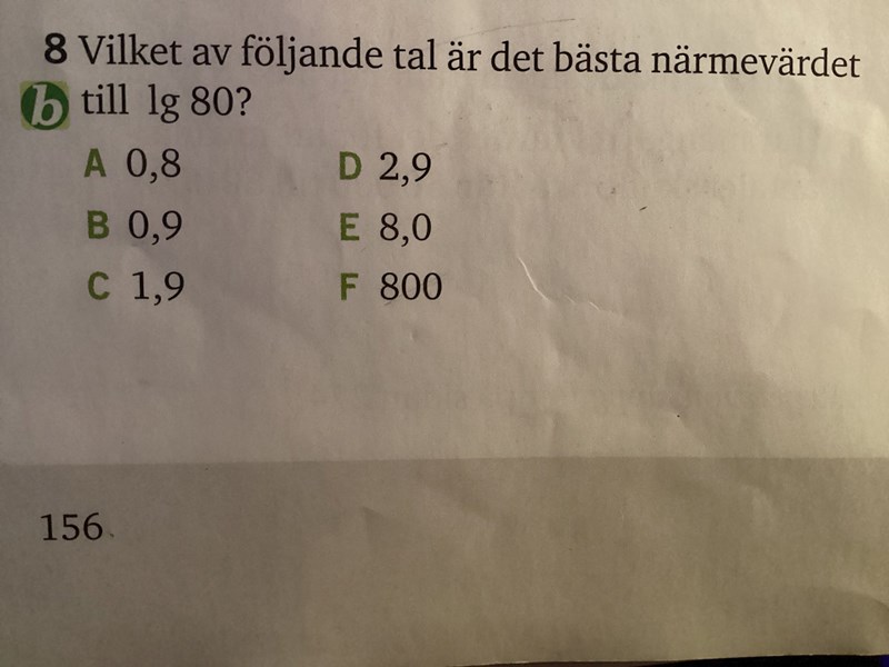 Börja med att tänka på att 101 = 10 och 102 = 100. Då kan du konstatera att lg 80 måste vara större än 1 men mindre än 2. Då kan du utesluta de flesta av värdena. Vilka möjligheter är kvar når du har gjort detta?