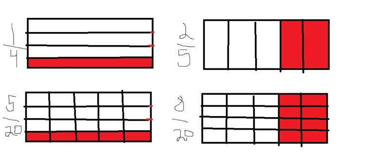 Du har helt rätt att det är lite komplicerat för att det är olika stora delar. Trixet är att ha en rektangulär tårta och att dela in den på olika håll. Se bild nedan. På ena hållet så delar jag in den i fjärdedelar och på andra hållet så delar jag in den i femtedelar. Jag markerar bitarna som äts upp. Om jag sedan (som du ser på de understa bilderna) fixar så att alla bitar blir lika stora och på båda bilderna delar in på båda hållen, så ser du att det blir till tjugondelar alla bitar. Och ser i bilden att totalt så har det ätits upp 13 delar av 20(13/20) och är då 7/20 kvar. Detta är samma metod som med beräkningarna, fast med en bild istället.