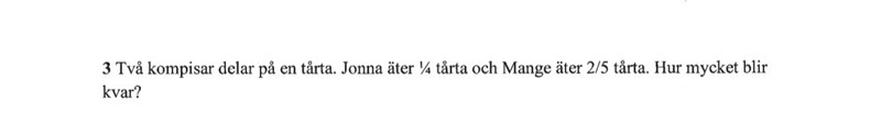 Sen bör man ta minus det som Jonna äter 1/4 och sedan minus det som Mange äter 2/5 för att få reda på hur stor andel som är kvar.