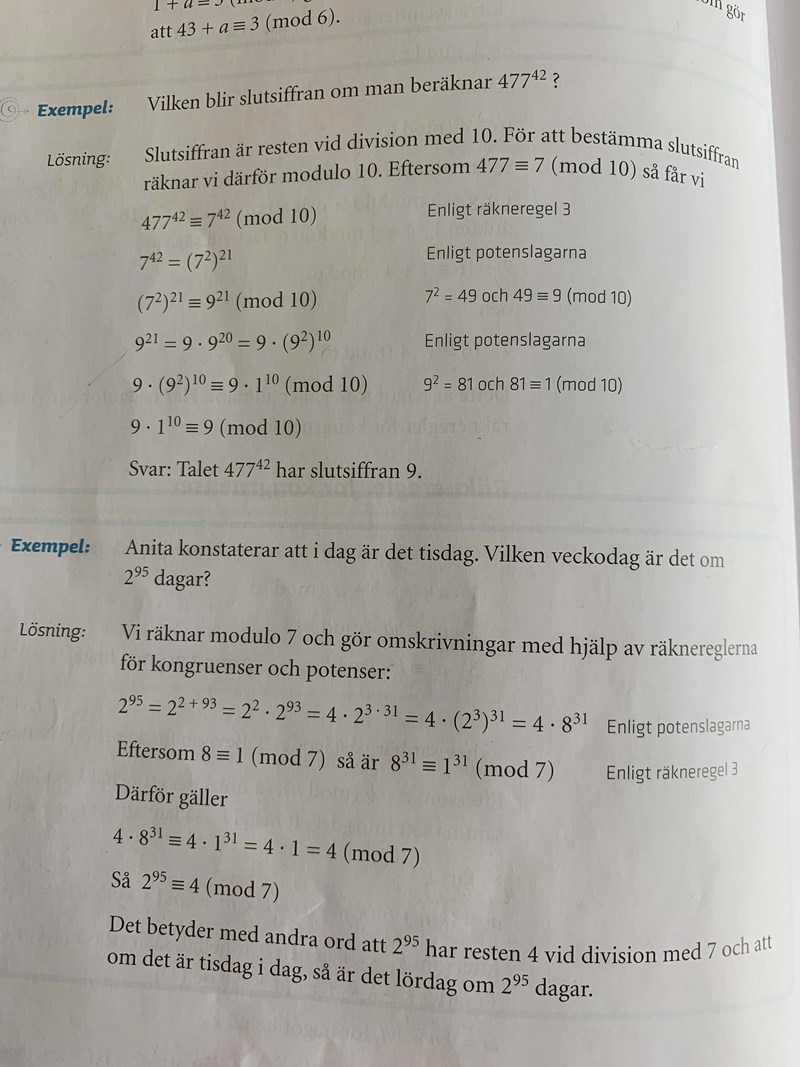 Smaragdalena skrev:Precis som jag skriev igår. så försöker man få till något som är kongruent med 1 (modulo det-man-håller-på-med), eftersom det är enkelt att beräkna potenser med basen 1. (Potenser med basen (-1) är lite krångligare, men ändå hyfsat enkelt.)