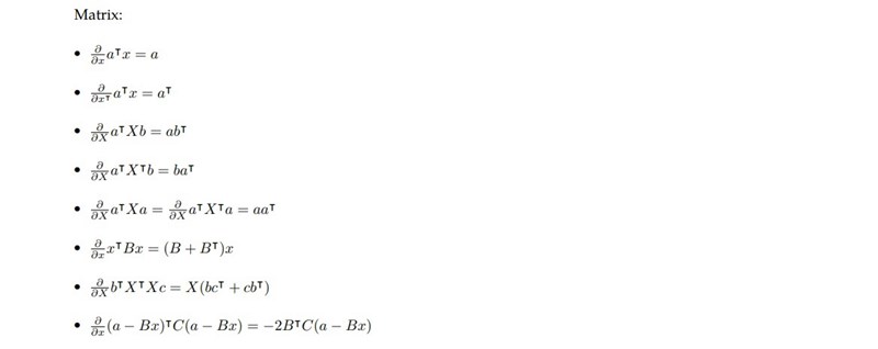 Jag söker efter en sida/pdf/bok där det tydligt definieras vad det innebär att derivera en matris och där man sedan går igenom räknereglerna på bilden med tillhörande bevis.