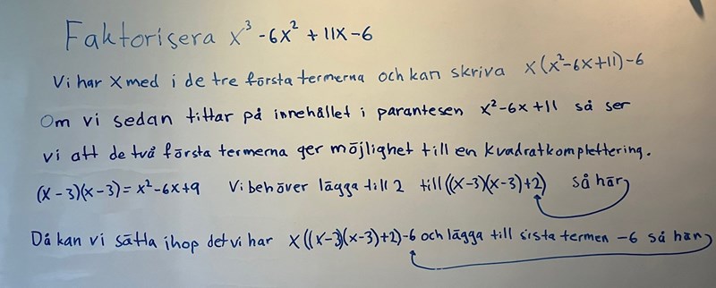 Hej! Jag skulle vilja få tips på hur jag ska tänka när jag ska faktorisera 3-gradsekvationer. T ex x3 - 6x2 + 11 x - 6. Hur faktoriserar jag denna?