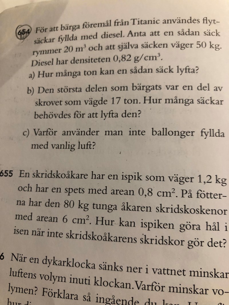 För att bärga föremål från Titanic användes flytsäckar fyllda med diesel. Anta att en sådan säck rymmer 20m3 och att själva säcken väger 50kg. Diesel har densiteten 0.82g/cm3.