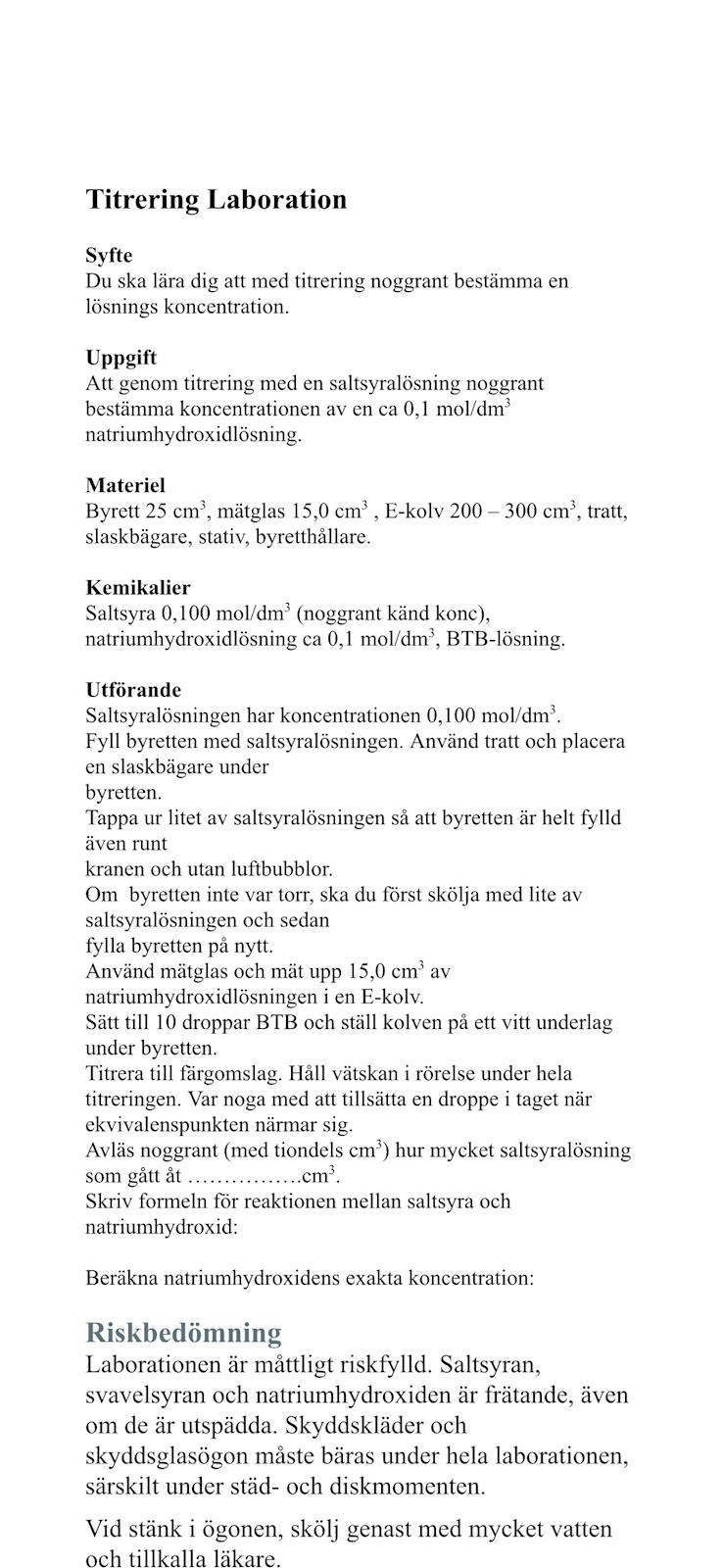 Genom detta vet du nu att substansmängden NaOH var 0,0003 mol. Och du vet volymen av natriumhydroxid (i cm3) som du började med, så nu kan du räkna ut koncentrationen av natriumhydroxidlösningen.