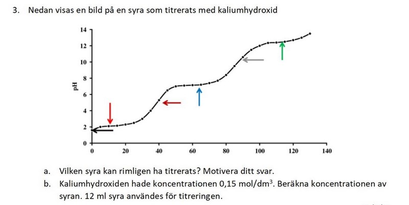 Vet ej var uppgiften kommer ifrån, vi fick den av vår lärare som testfråga inför ett prov. Som hon skrev tidigare så är n(HA)=n(OH-) i ekvivalenspunkten. I den första ekv.-punkten har 40 ml bas tillsatts och eftersom vi känner till dess koncentration så kan vi beräkna substansmängden. n=c/V. Då vet vi även substansmängden syra. Eftersom vi vet att 12ml syra användes kan vi även beräkna syrans koncentration, med samma formel som tidigare.