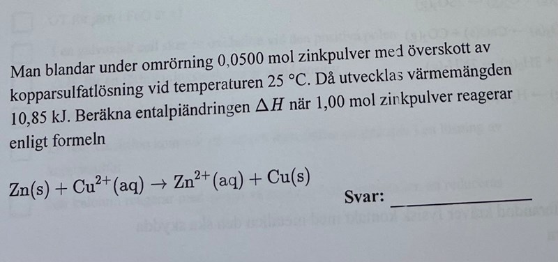 Du vet hur mycket värme som utvecklas när 0,0500 mol (= 1/20 mol) zink reagerar. Hur många gånger mer värme frigörs när 1,00 mol zink reagerar?