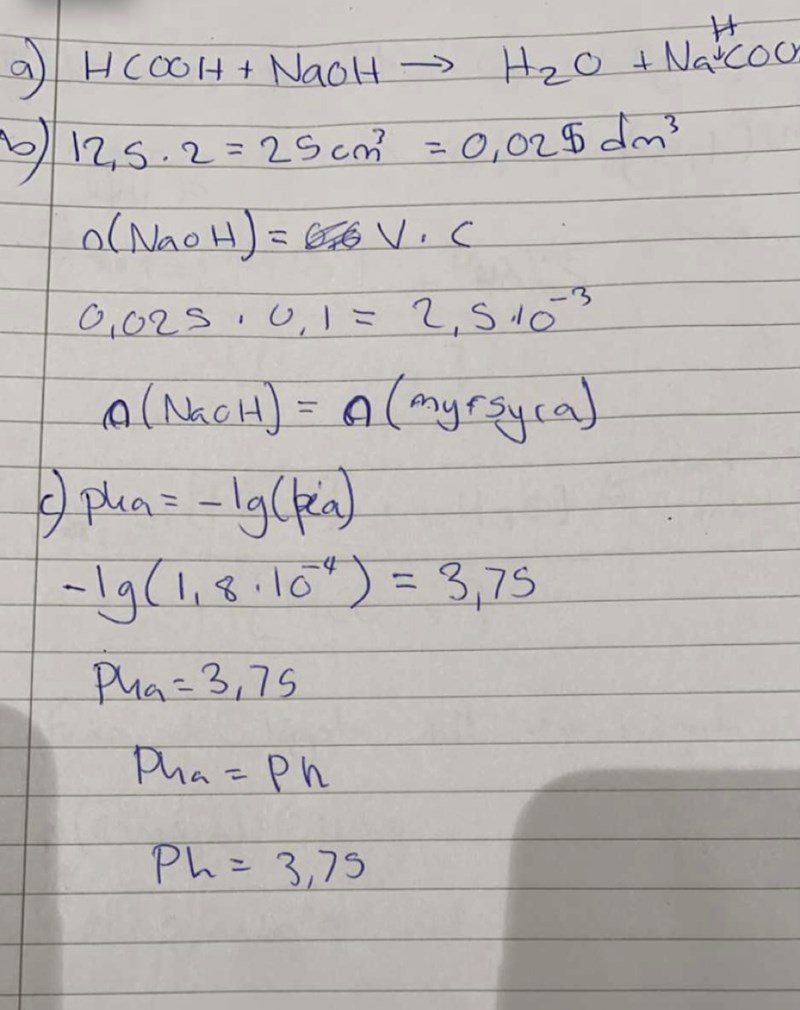 men hur går jag vidare. Jag tänkte att eftersom HCOOH och NaOH är ekvivalenta så är substasnmängden samma för båda, eller?