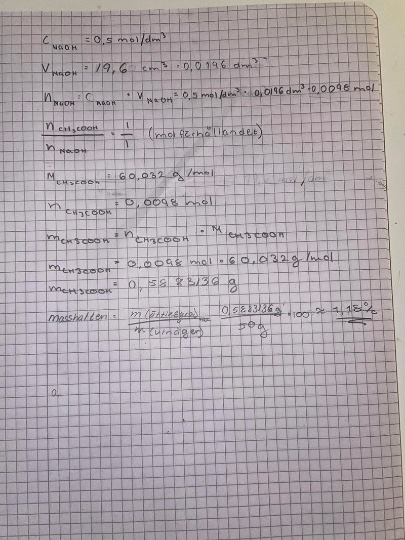 Hej, jag skulle behöva hjälp med att beräkna masshalten av ättiksyran. Detta har jag gjort: