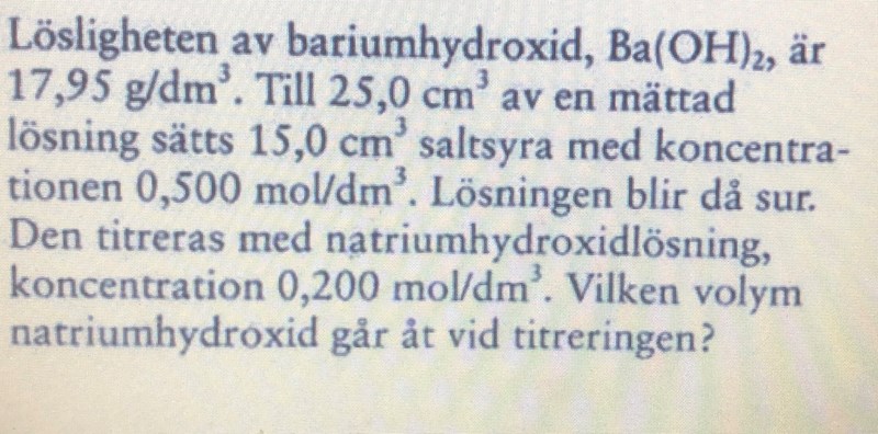Hur många mol hydroxidjoner finns det i 25,0 ml mättad bariumhydroxidlösning? Hur många mol oxoniumjoner finns det i 15 ml saltsyra med koncentrationen 0,5000 mol/dm3? Hur många mol oxoniumjoner finns det kvar när alla hydroxidjoner har reagerat?