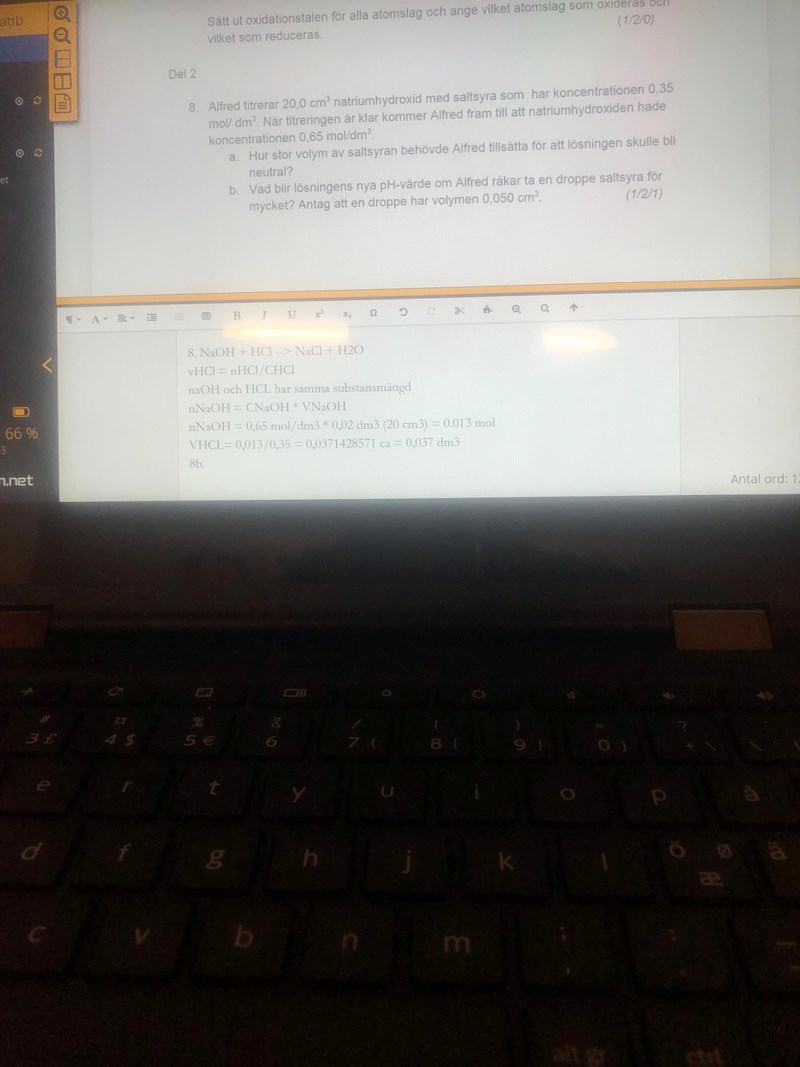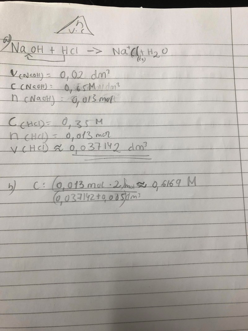 Det var en fruktansvärt svårläst bild, jag fick ta fram bilden och förstora den för att kunna tyda vad där står. Det ser ut som om du har kommit fram till rätt svar på volymen saltsyra men det finns mycket som kan förbättras på i din redovisning.
