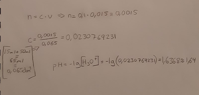 I en labb ska vi blanda 15 ml 0,1 M HCl med 50ml vatten. (Edit: har ändrat 0,5M till 0,1M då jag skrev fel).