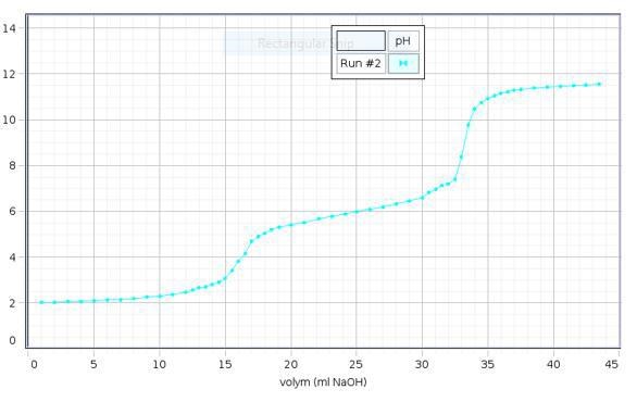 När titreringen börjar, har titranden (lösningen som titreras) ett lågt pH = 2. När man tillsätter de första 15 ml bas, ändras pH endast med 1 enhet, men när man sätter till ytterligare 4 ml ökar pH med 3 enheter. Där har du din första ekvivalenspunkt - vid ungefär 17 ml har du tillsatt lika många mol bas som vad det fanns syra från början. Vid ungefär 34 ml har du din andra ekvivalenspunkt - där har du tillsatt dubbelt så många mol bas som du hade syra från början.