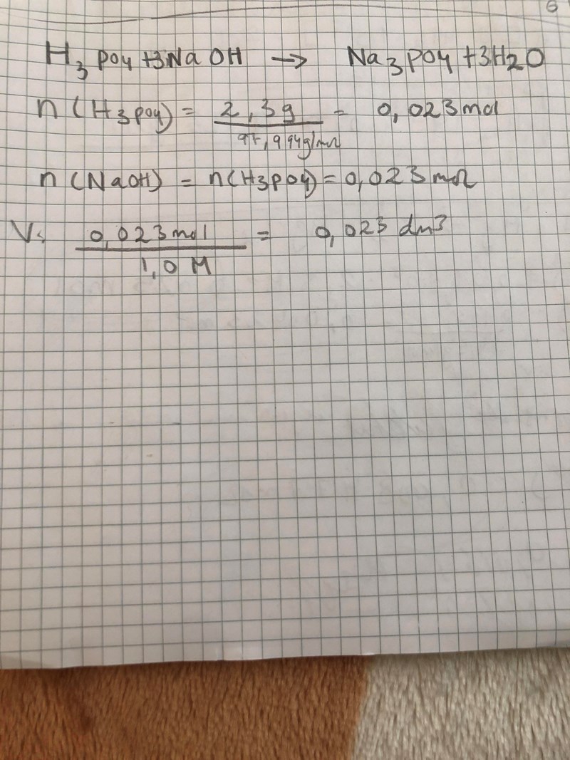 Två rader ner skriver du att det reagerar lika stor mängd fosforsyra som natriumhydroxid.