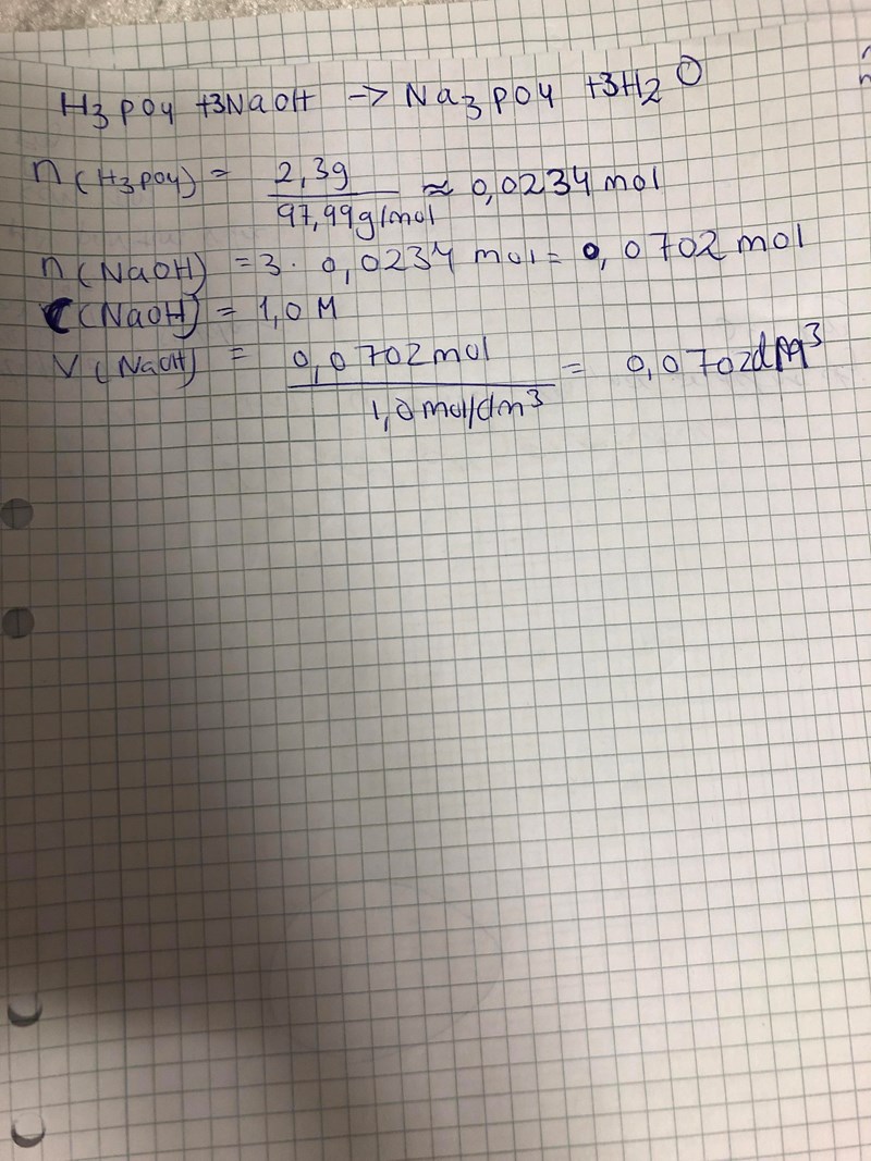 I formeln skriver du att 1 mol fosforsyra reagerar med 3 mol natriumhydroxid.