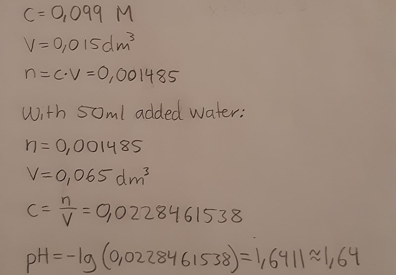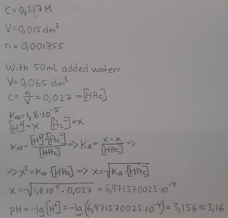 mattelinnea skrev:Nu har jag också beräknat pH-värdet innan titreringen vilket blev ganska likt det faktiska pH-värdet som var 3,17.