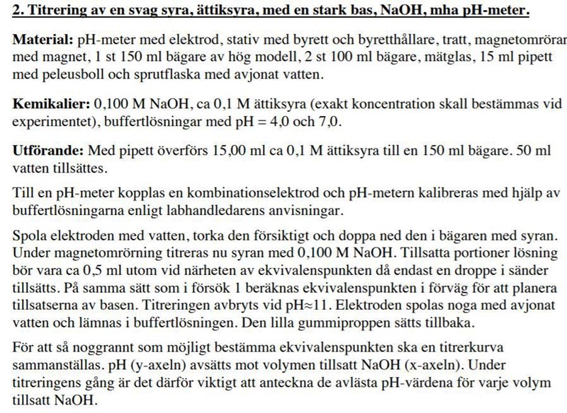 Teraeagle skrev:Du behöver repetera vad titrering är för något och hur man räknar, kolla på något exempel i boken! Tanken är att man droppvis tillsätter en titrator, i detta fall lösningen med natriumhydroxid, till titranden (lösningen med ättiksyra) och läser av pH-värdet. När man har nått ekvivalenspunkten i en syrabastitrering som denna har man tillsatt lika många mol hydroxidjoner som det fanns av syran i titranden från början.