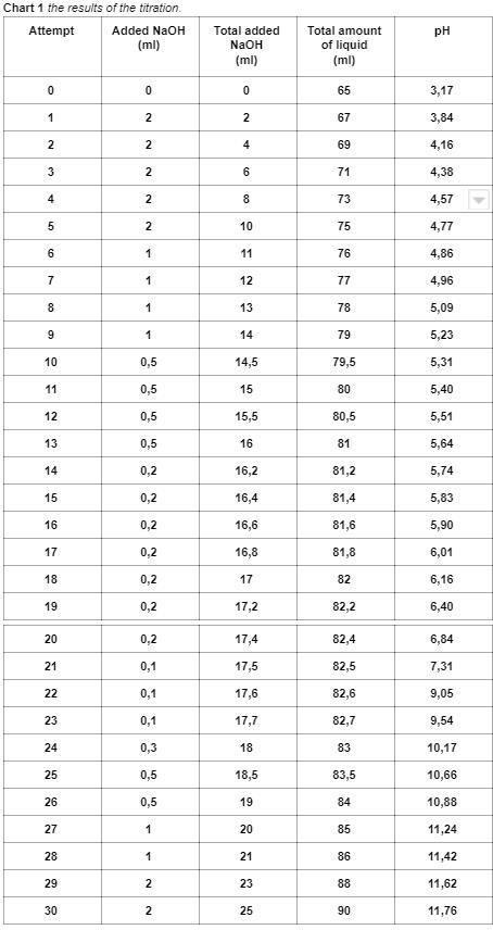 Enligt professorn var titreringskurvan samt tabellerna bra. Det var bara beräkningarna i mitt första inlägg som det var fel på.