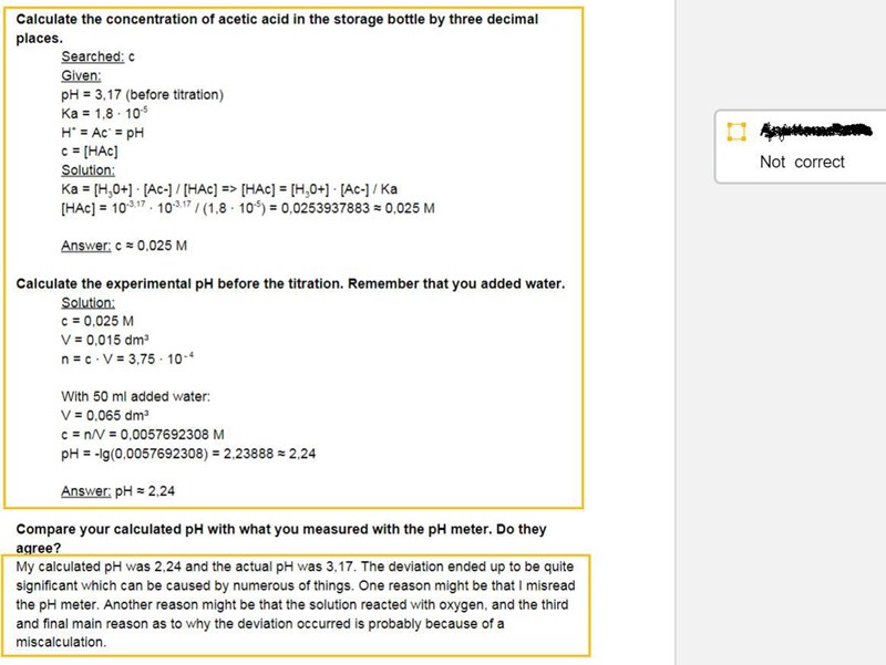 Jag har fått retur på min labb som handlar om titrering. Jag har bara fått en kommentar: not correct.