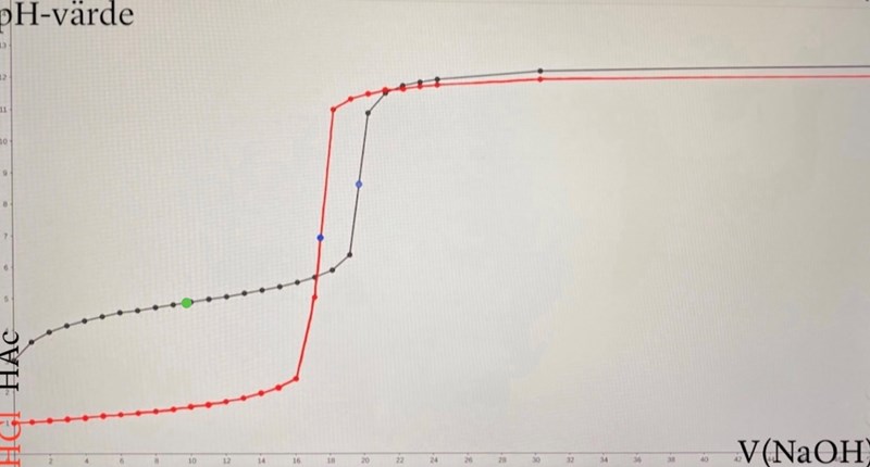 Den gröna punkten på grafen för HAc visar koordinaterna för pKa-värdet alltså vid pH= 4.89774 och vid V(NaOH) =9.749 *10⁻³ dm³, se diagram nedan.