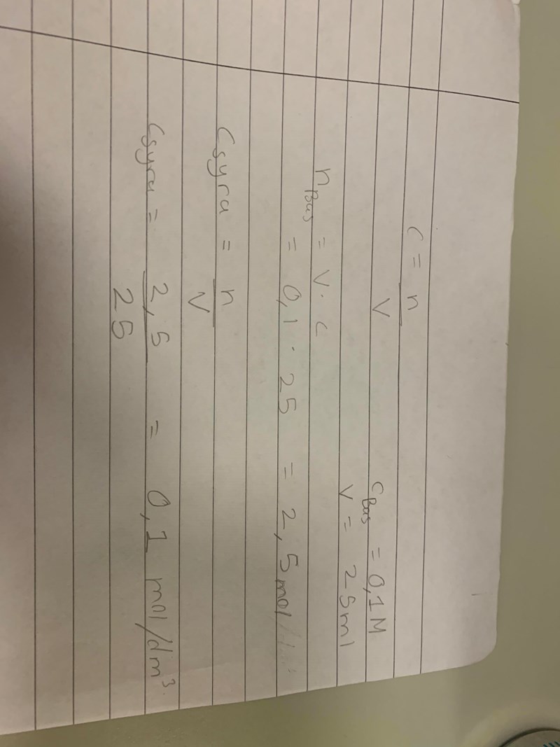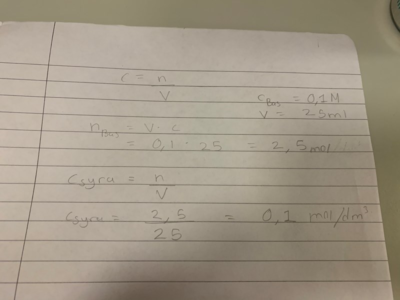 Koncentration syra: nsyra = nbas = 0,0031 mol, v = 25 ml = 0,025 dm3, c = n/v = 0,124 mol/dm3.