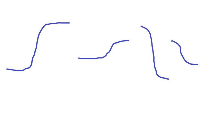 Fyra pH-kurvor. Från vänster till höger: Stark syra titreras med stark bas, svag syra titreras med stark bas, stark bas titreras med stark syra, svag bas titreras med stark syra. Man är inte så dum att man titrerar en svag bas med en svag syra (eller tvärtom).
