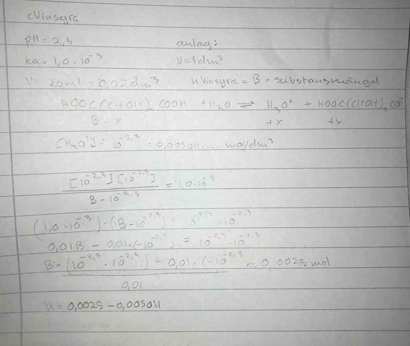 Har jag gjort rätt hittills? Ska få ut X för att ta reda på mängd oxoniumjoner men sen da? ska få ut koncentrationen oxoniumjoner för att sedan få ut pH värdet men är volymen 2 kubimdecimeter?