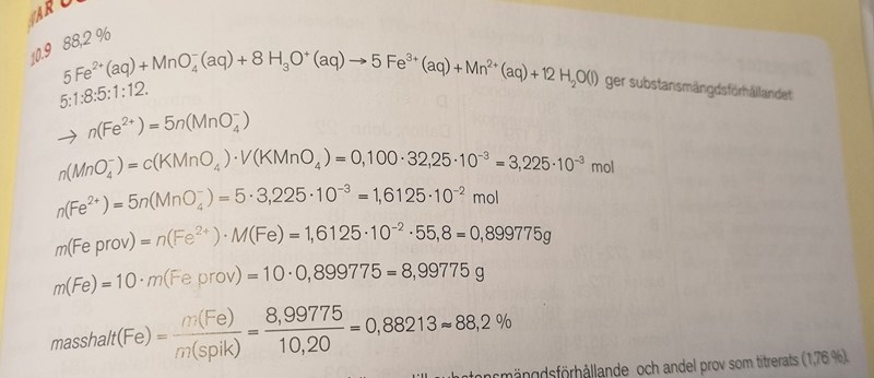 Läs uppgiften: Spiken löstes upp i svavelsyra, lösningen späddes till 500,0 ml och 50,00 ml av denna lösning titrerades... Det som titrerades var alltså bara 1/10 av hela järnspiken.